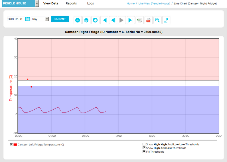 •The High Range Alarm and Low Range Alarm (if set from the Alarm Settings window) Thresholds are overlaid on the line graph, giving a clear visual indication of whether there has been an excursion either above or below the High and Low Range Alarm settings. See Figure 1145 below: